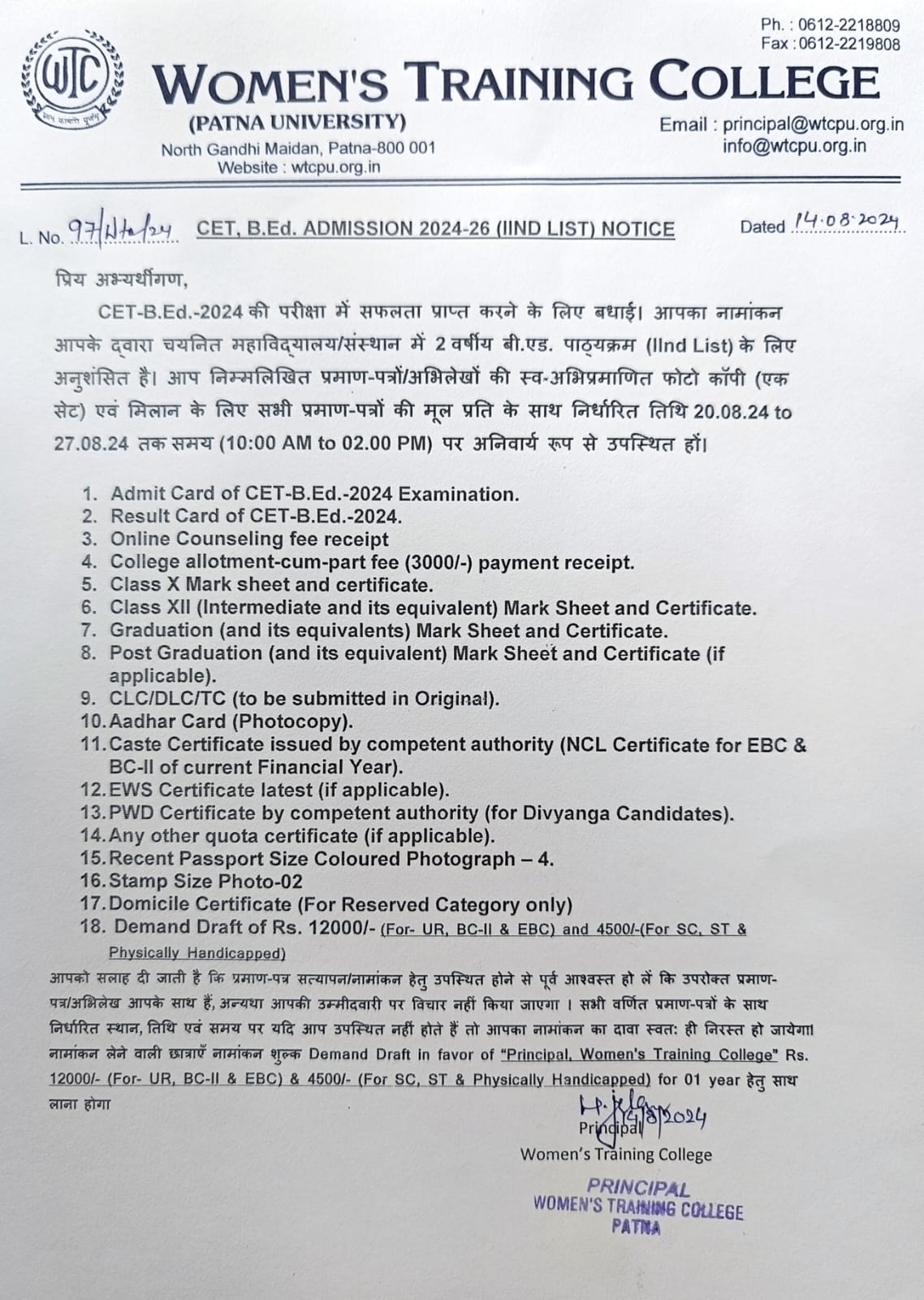 B.Ed. Admission Notice Session 2024-26 (Second List)