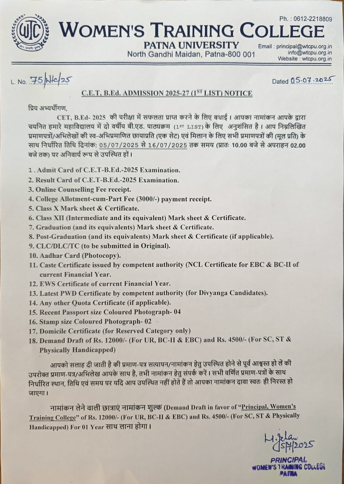 C.E.T. B.Ed. ADMISSION 2025-27 (1ST LIST) NOTICE